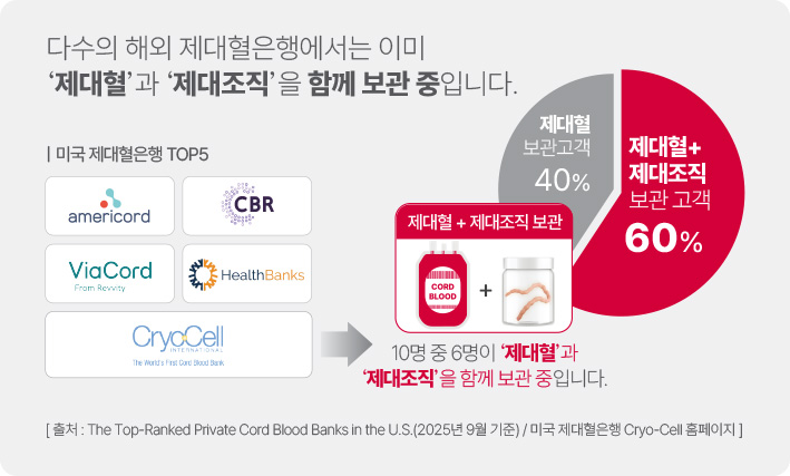 이미 다수의 해외 제대혈은행에서는 전 세계적으로 4만 5천건 이상의 이식으로 치료적 활용 가능성을 입증한 ‘제대혈’과 다량의 중간엽줄기세포를 포함해 미래 다양한 질병 치료 가능성을 극대화할 수 있는 ‘제대조직’을 함께 보관하여 미래 질병 치료에 대비하고 있습니다.