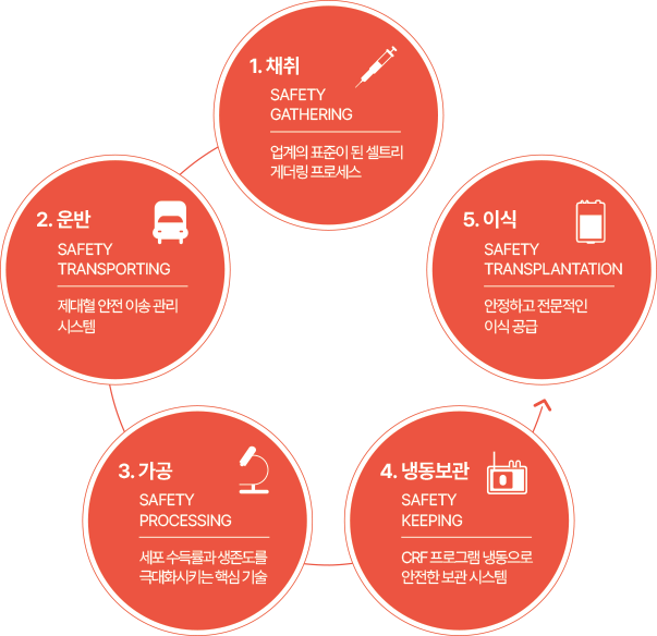 셀트리 제대혈은행의 독보적인 펜타 세이프티 프로세스는 보관 후 사용에 초점을 맞춘 제대혈 보관 시스템입니다. 제대혈의 채취부터 운송, 검사/분리, 이식까지 단 한순간의 실수도 용납하지 않습니다.